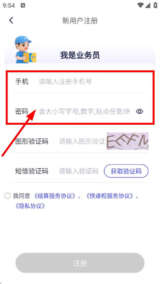 3、在业务员注册信息填写页面,输入注册手机号,设置密码。