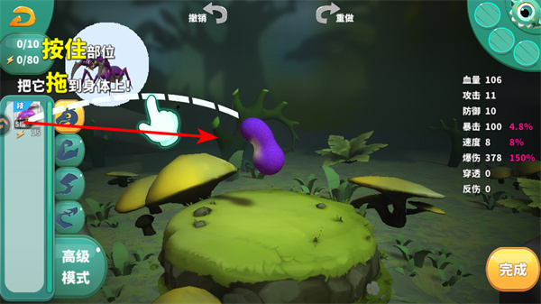 2、在生物自定义界面,按住部位模块拖到生物身体上,这是改造生物的核心操作,可调整生物属性与技能,提升战斗能力。