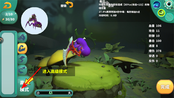 3、点击高级模式选项,这是进阶改造生物的关键步骤,进入后可对生物部位进行更精细的调整,打造专属强力生物。