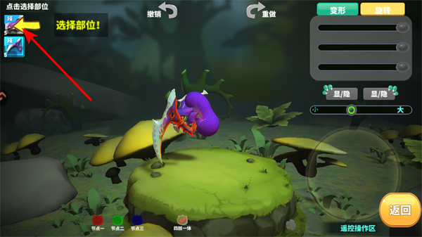 4、在高级模式中,点击选择部位选项,这是精准改造生物的基础操作,选择后可对指定部位进行变形、旋转等操作。