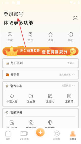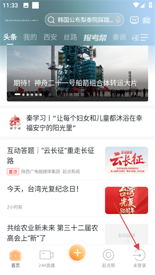 1、打开起点新闻,点击页面右下角未登录,可进入登录账号页面。