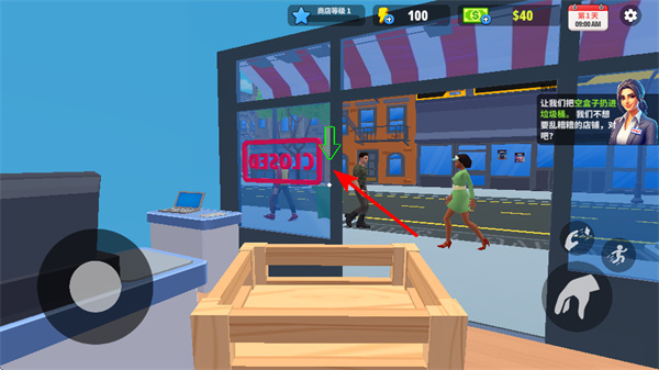 1、在超市运营中,处理垃圾时点击垃圾桶,这是维持超市环境的关键操作,空盒子扔进垃圾桶保持超市整洁,提升效率。