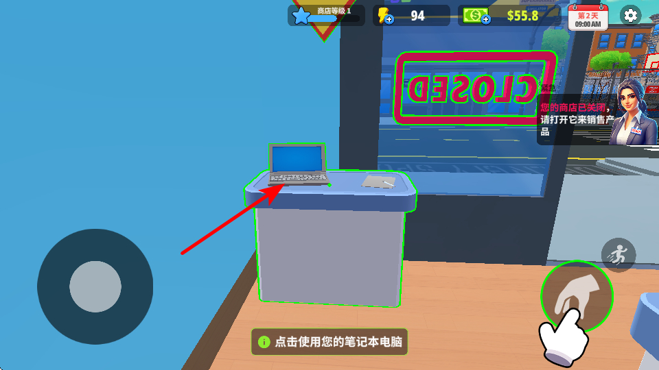 4、次日开启营业前,点击使用笔记本电脑,这是开启超市运营的基础操作,点击后可进行商品补货。