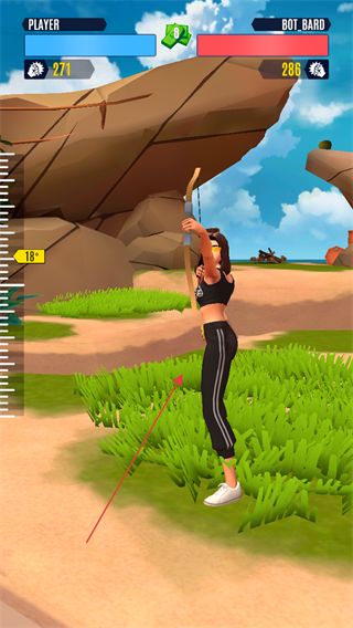 2、根据场景地形如水域、岩石区和距离,精准调整角度,确保箭的轨迹准确。