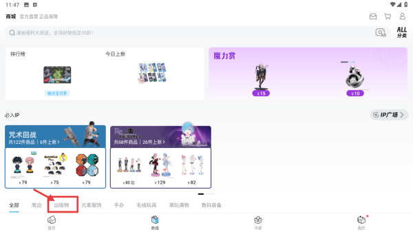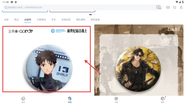 2、在商城页面,点击出版物分类,浏览动漫周边出版物商品列表。