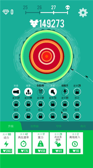 1、瞄准屏幕中央的靶心区域发射炸弹,尽量命中红色核心区域,以获取更高分数。