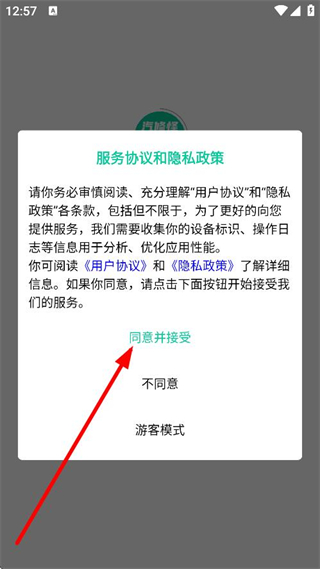 1、在服务协议和隐私政策弹窗中,点击同意并接受,进入首页。