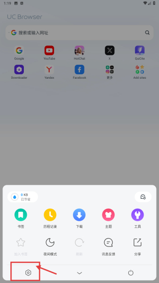 1、打开浏览器类应用,点击底部菜单按钮,弹出功能菜单。