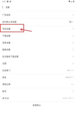 3、在设置页面,点击浏览设置选项,进入浏览设置页面。