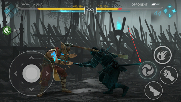 1、战斗状态下,左边轮盘控制角色移动方向与攻击挥砍方向。