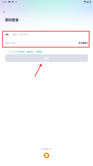 4、在密码登录页面,输入手机号和密码后,点击登录按钮,完成密码登录操作。