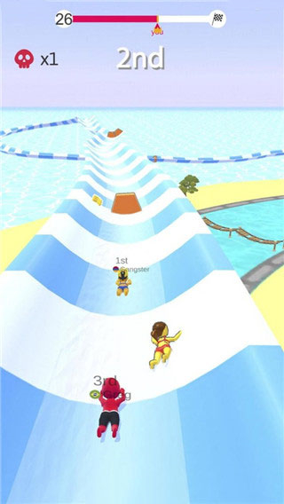 1、操控角色在水上滑梯赛道上滑行,与其他选手竞争排名如从16TH提升到6TH、1ST。