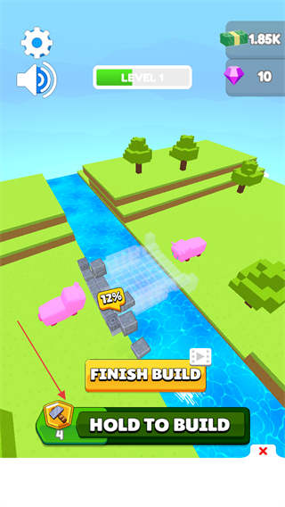 4、利用通关获得到的砖块给小猪搭建石头桥,使它们相见。