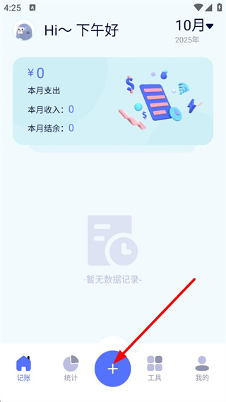 2、在APP首页,点击底部蓝色+的按钮,进入支出类别选择页面。