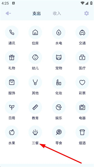 3、在支出类别选择页面,点击三餐,进入支出详情填写页面。