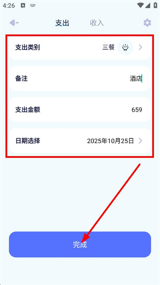 4、在支出详情填写页面,填写备注、支出金额、选择日期后,点击完成,即可记录该笔支出。