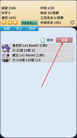 2、在员工界面点击招募按钮,进入可招募的员工界面。