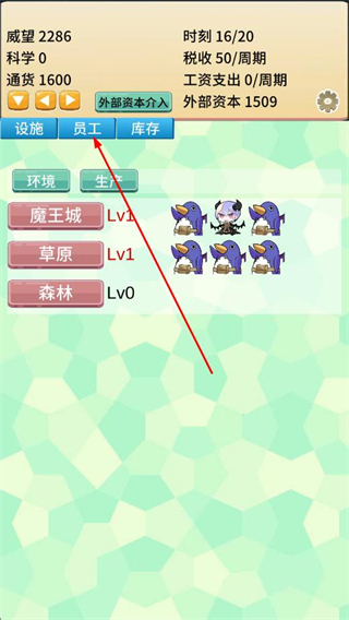 1、进入游戏后,点击员工按钮,查看现有员工情况,了解员工的力、速、智等属性。