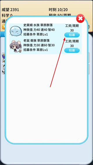 3、选择符合招募条件的员工,如史莱姆等,点击招募进行招募。