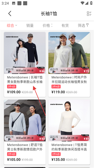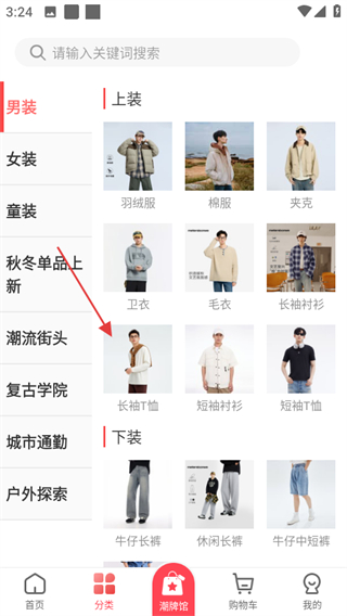 2、在商品分类页面,选择心仪分类如潮流街头下的长袖T恤,可进入长袖T恤商品列表页面。