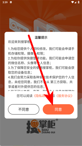 1、打开搜掌柜,在温馨提示弹窗中点击同意,进入首页。
