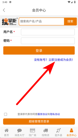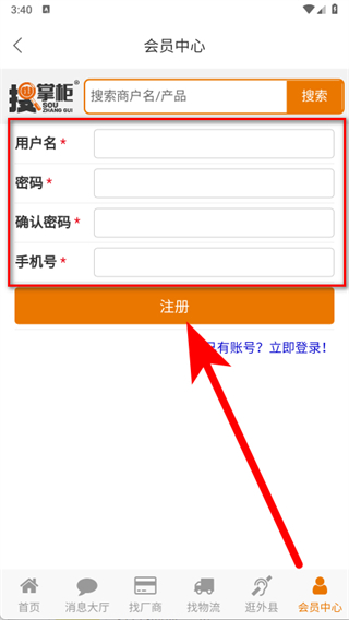 4、在注册界面,填写用户名、密码、确认密码及手机号,点击注册,完成会员注册。