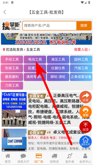 2、在五金工具页面,点击电动工具分类,进入电动工具批发商家列表页面。