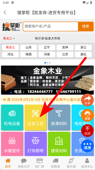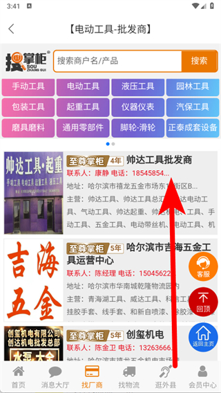 1、打开搜掌柜,在首页点击五金工具分类,进入五金工具批发商家列表页面。