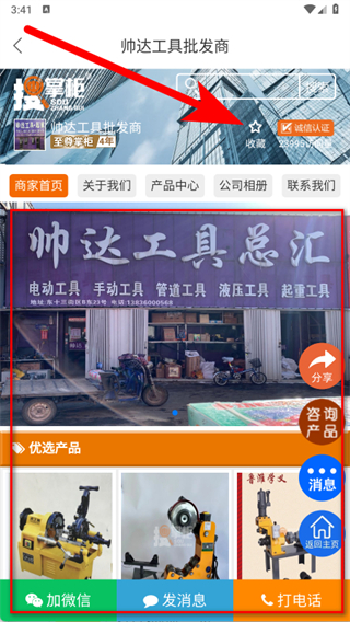 4、在商家详情页面,查看商家首页、产品中心、公司相册等板块,点击收藏,方便联系。