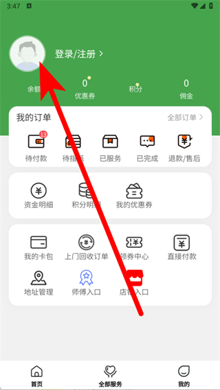 2、在个人中心页面,点击登录注册区域,进入手机号登录界面。