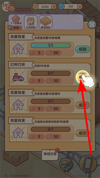 3、任务模块中点击前往可快速完成如放置新家具、收取快递等任务,完成后领取奖励,积累资源用于后续装修与装扮。