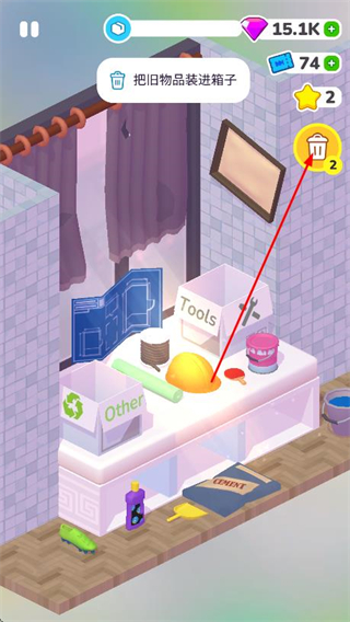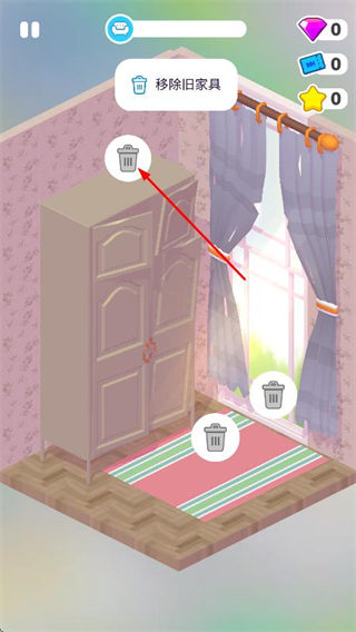 1、点击旧家具上的垃圾桶图标,移除旧家具,清理房间空间。