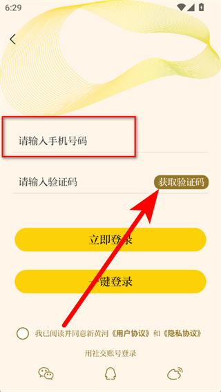 3、在登录界面,输入框中填写号码,点击获取验证码按钮。