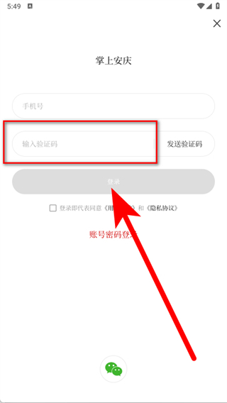 3、在登录界面,输入框中填写号码,点击发送验证码按钮。