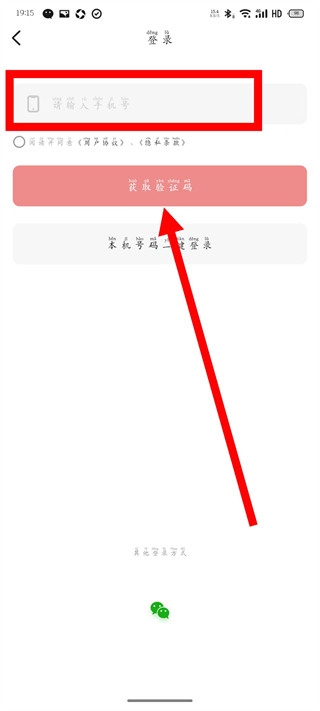 3、在登录界面,输入框中填写号码,点击获取验证码按钮。