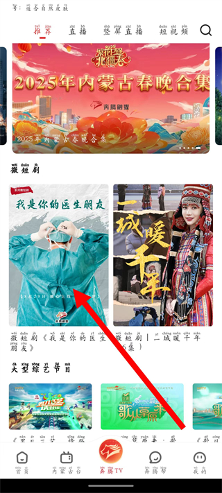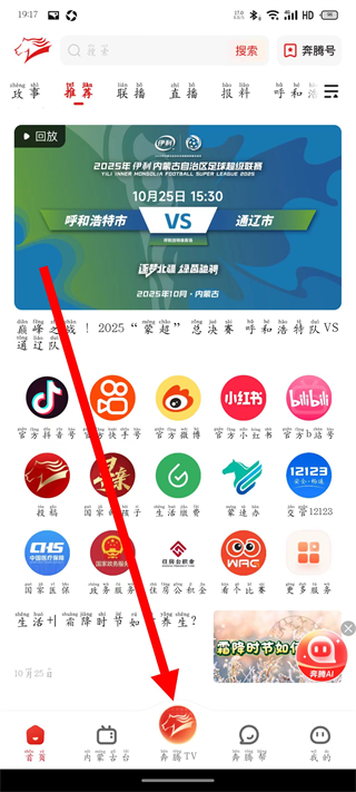 1、打开奔腾融媒,点击底部奔腾TV标签,进入各类视听资源的影视内容专区。