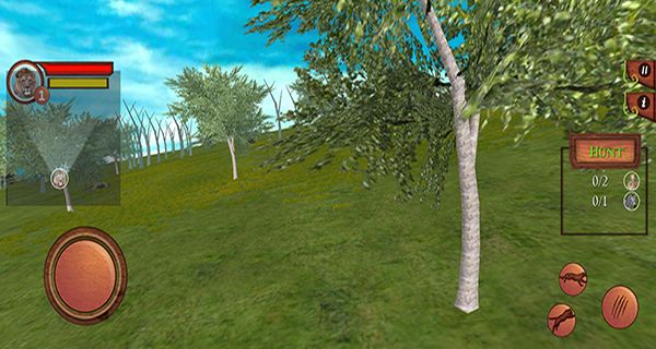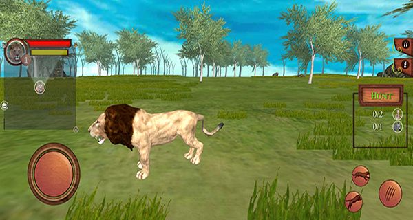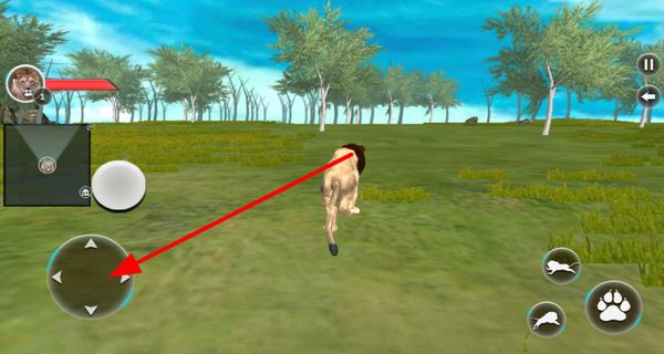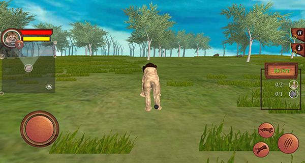 1、通过虚拟摇杆操控狮子在草原场景中移动,探索不同区域,寻找猎物或同伴,为狩猎做准备。