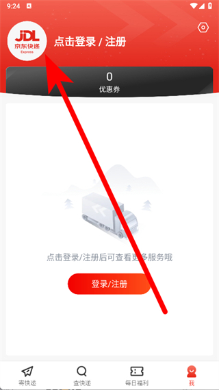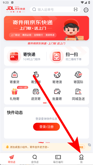 1、打开京东快递,点击底部导航栏的我,进入个人中心页面。