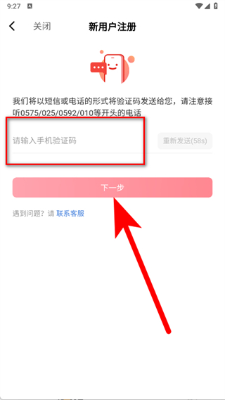 5、在对应输入框填写验证码,点击下一步,完成账号注册流程。