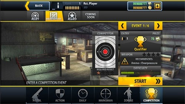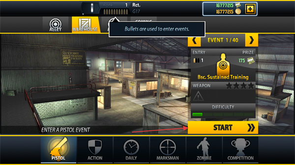 1、选择Bsc.SustainedTraining赛事,点击START进入手枪射击任务。