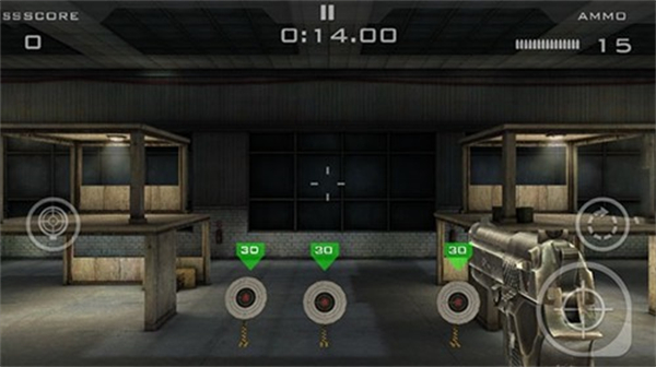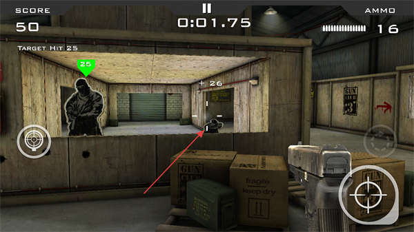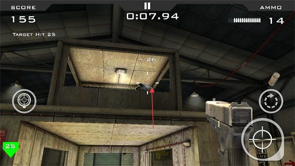 2、瞄准带有绿色25标识的目标射击,积累分数,注意剩余弹药和时间。