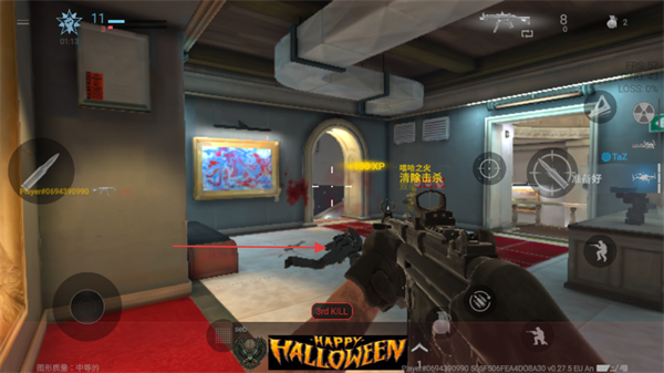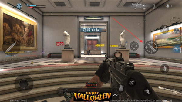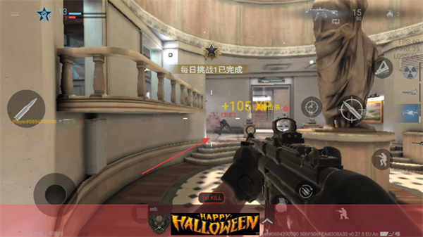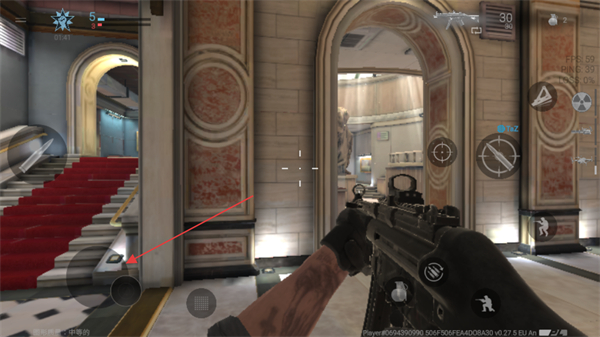 1、操控移动摇杆在建筑内移动,利用掩体如柱子躲避敌人,寻找进攻时机。