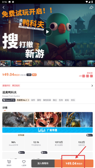 4、在游戏详情页,点击¥49.04 折后价按钮,完成该游戏的购买操作。