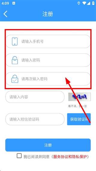 3、在注册信息填写页面,输入手机号、设置密码并再次确认密码。