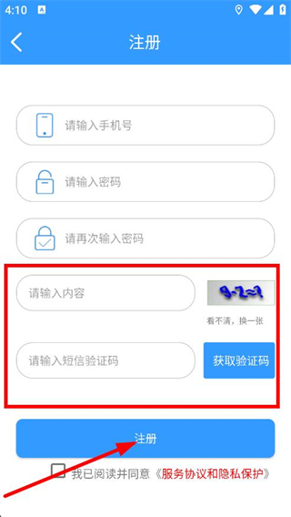 4、在注册信息填写页面,输入图形验证码和短信验证码,点击注册,完成账号注册。