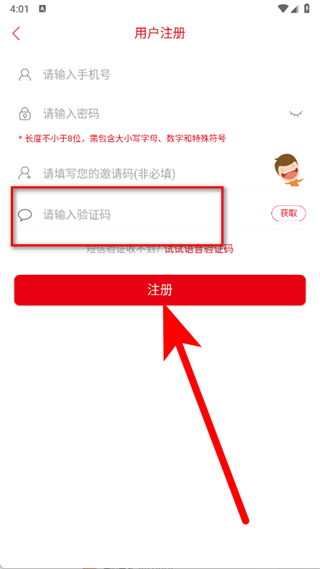 5、输入收到的短信验证码后,点击注册按钮,完成账号注册流程。