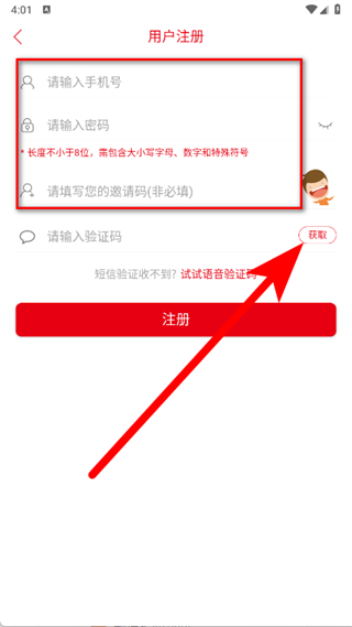 4、依次输入手机号、设置密码,点击获取按钮,获取短信验证码。