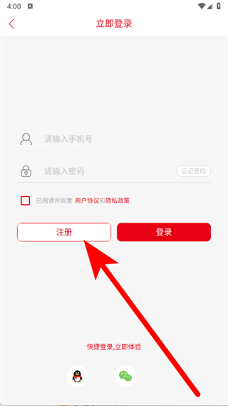 3、在立即登录界面,点击注册按钮,进入用户注册页面。
