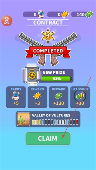 4、完成合约任务后,点击CLAIM领取奖励,解锁新关卡,继续挑战西部狙击任务。