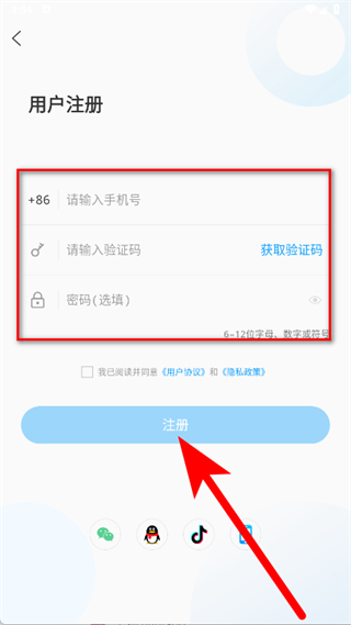 4、输入手机号,点击获取验证码并填写收到的短信验证码,勾选后,点击注册按钮,完成注册流程。